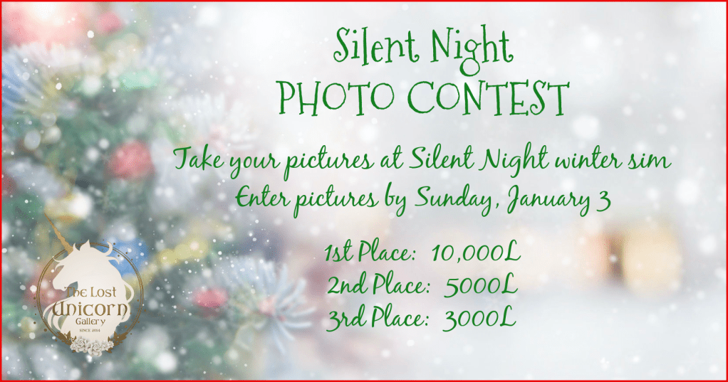 The Lost Unicorn Gallery is holding its annual Photo Contest again this year! This time we ask you to enter pictures taken at Silent Night winter sim only. The contest will be judged based on creativity, originality and how well your picture shows the beauty of the sim.