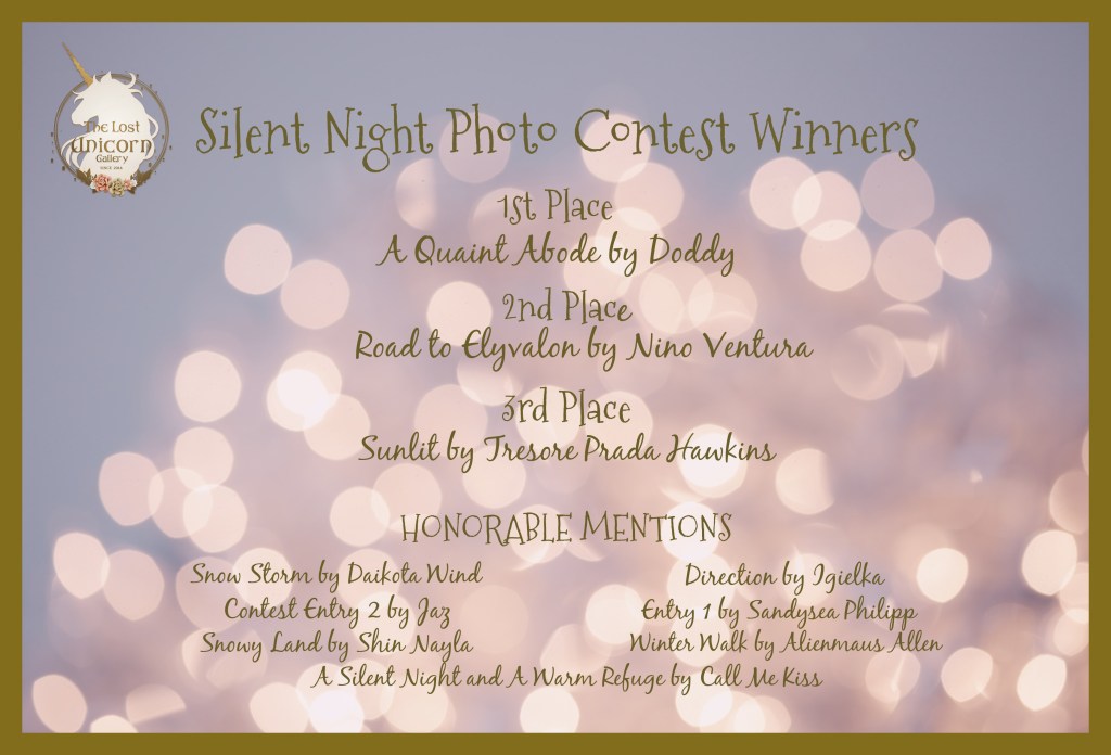 Thank you to everyone for your patience in waiting for the results of the Silent Night Photo Contest! We finally have some winners! Thank you to ALL those who entered and for your amazing and absolutely beautiful additions to our Lost Unicorn group collection, each and every one of the 132 entries is special 🙂
