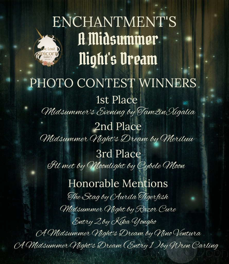 I’d like to finally announce and congratulate the winners of this round of Enchantment’s A Midsummer Night’s Dream Photo Contest! I’m sorry it took so long, I ran a bit behind this week. Thank you to everyone who entered, all the pictures were stunning and magical! The winning pictures will be on display at The Lost Unicorn Gallery soon.