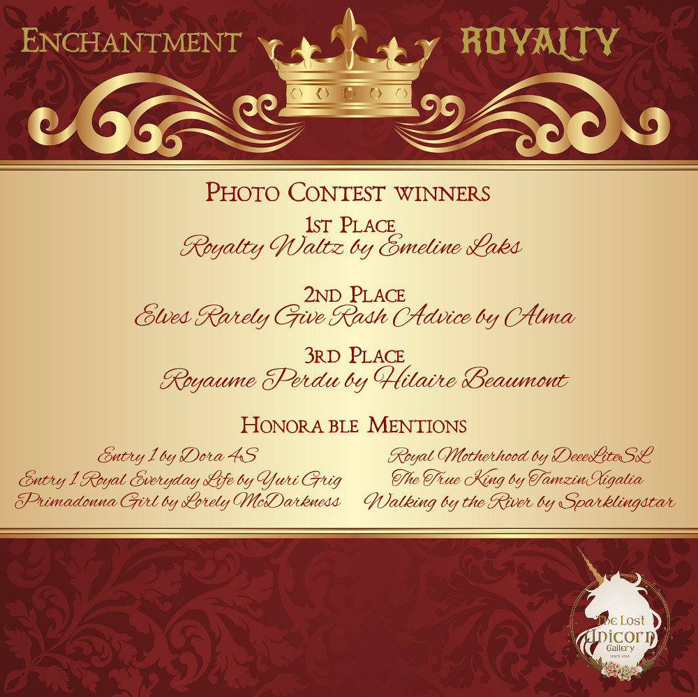 Thank you to everyone who entered the Enchantment Royalty Photo Contest! This was another amazing round with some fabulous pictures! Congratulations to the winners, the pictures are now on display at The Lost Unicorn Gallery in world 🙂